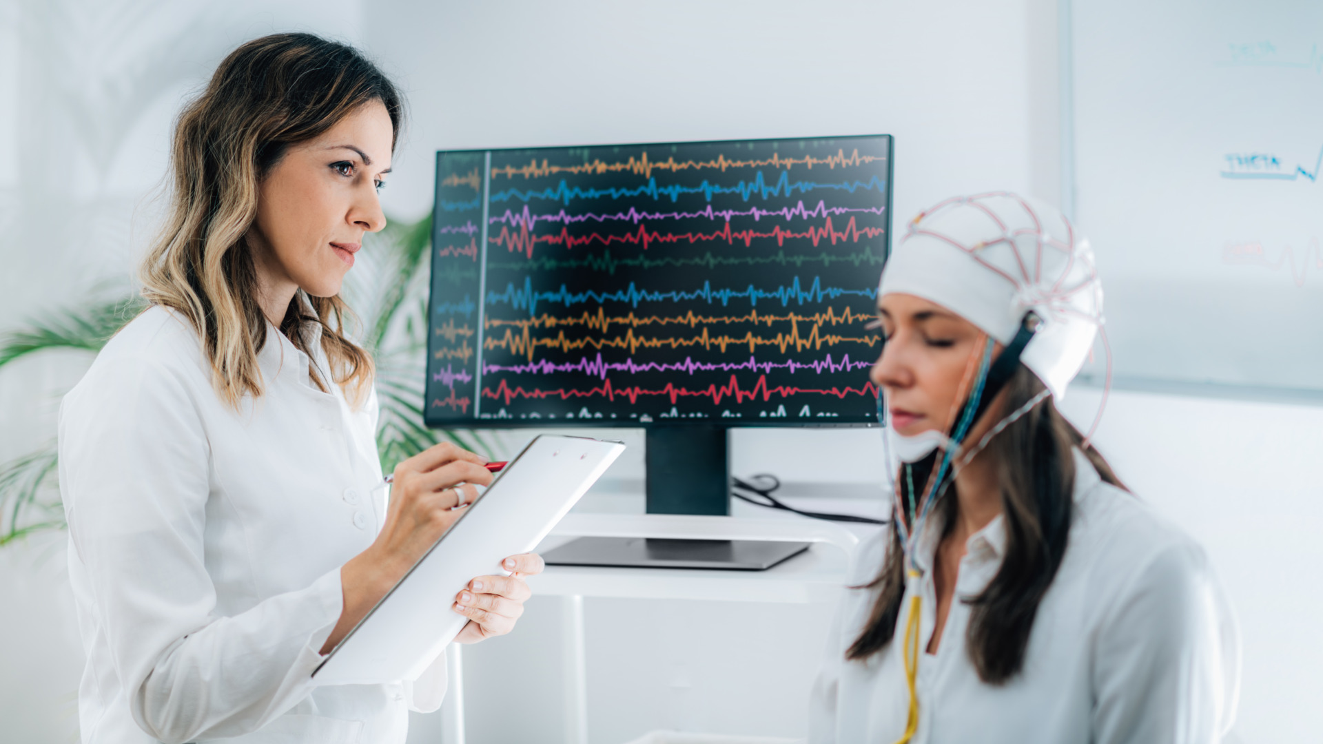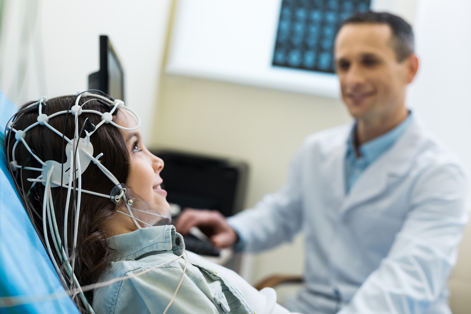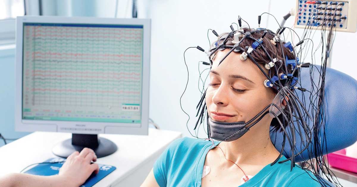 Registra a atividade elétrica do cérebro para auxiliar no diagnóstico de alterações neurológicas.
